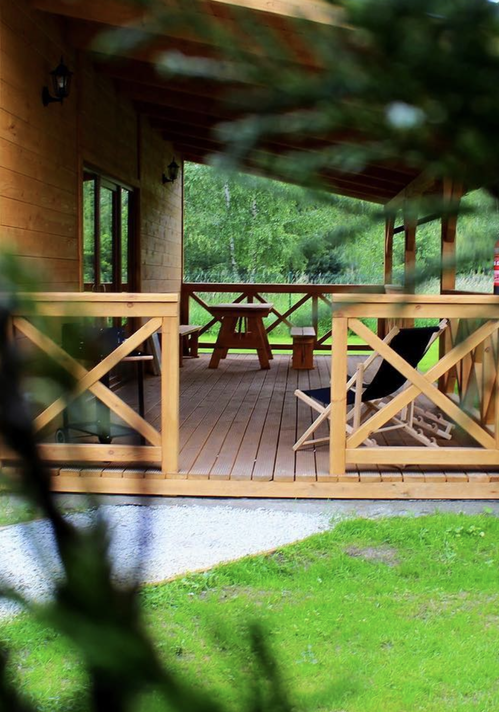 Każdy domek posiada przestronny, zadaszony taras. Na tarasie znajdują się dwa leżaki, zestaw biesiadny oraz grill.